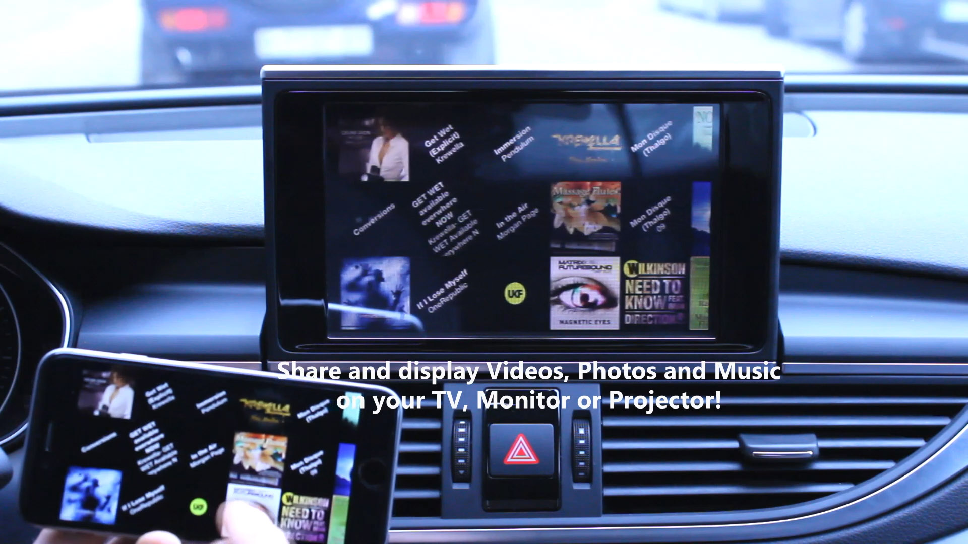 Transfer your images, videos, music or data files from your mobile devices: Smartphones, iPad, iPhone, Samsumg Galaxy, PC, laptop...in real time to your monitor, TV, projector or screen with HDMI or RCA connection.