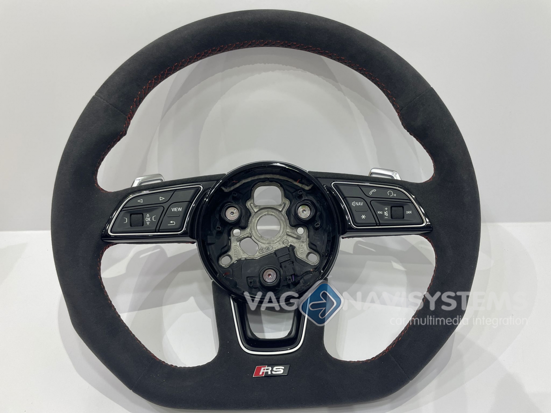 Volante multifunción original Audi; tipo "flat" ("achatado") en alcantara, con costuras rojas.